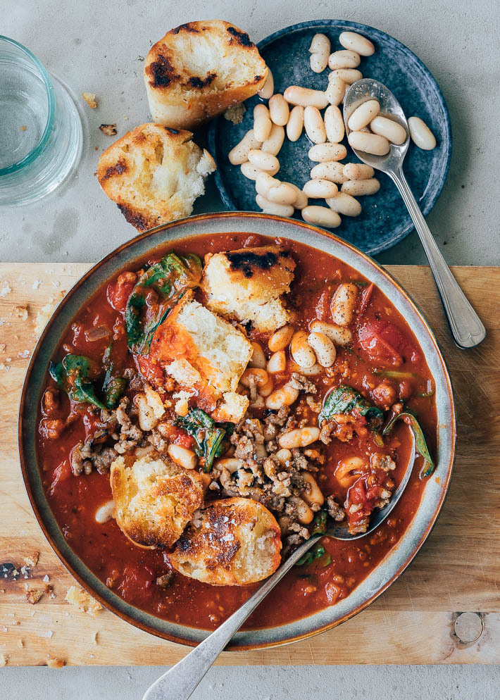 Vandaag een lekker recept voor een Italiaanse klassieker! Deze ribollita soep is een Toscaanse broodsoep, gemaakt met brood en groenten. Er zijn natuurlijk allerlei variaties, maar de belangrijkste ingrediënten zijn overgebleven stukjes brood en bonen. Omdat dit een snel recept is gebruik ik gewoon bonen uit blik. Wanneer je meer tijd hebt kun je ook gedroogde bonen gebruiken. Zorg er dan wel voor dat je ze een avond van te voren hebt geweekt. Het brood wat ik gebruik, bak ik knapperig. Het is een twist aan dit recept, want normaal voeg je het brood toe aan de soep, het wordt lekker sompig en neemt de smaak van de soep aan. Maar ik vind dat knapperige superlekker. Daarom bak ik het brood in dit recept knapperig in roomboter en olie en voeg ik het op het laatste moment aan de soep toe.