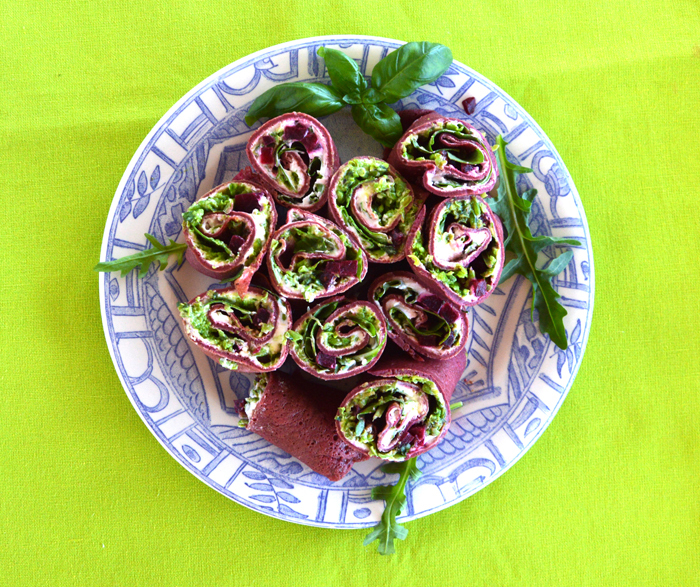 Waar waren we gebleven met mijn zomerserie Zing, vecht, huil et cetera? Juist, bij ‘werk’. Een lekker lunchrecept om mee te nemen naar kantoor. Nu eens geen bammetjes in je broodtrommel, maar deze vrolijk paarse bietenwraps gevuld met roomkaas en luchtige doperwtenpuree.
