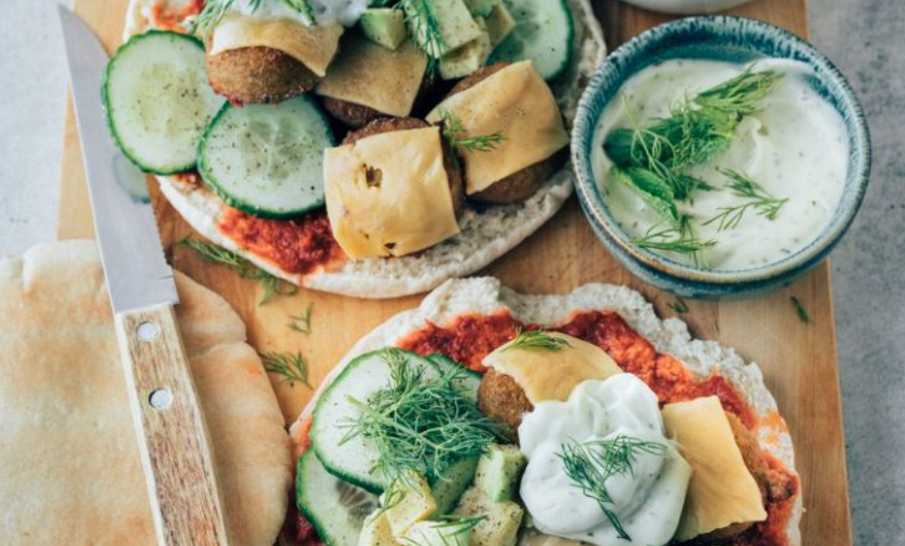 Lekker broodje pita falafel. Een leuk recept wanneer je iets lekkers en voedzaams wilt eten maar weinig tijd hebt. Wij vonden het leuk om een kleine twist aan dit recept te geven door over de falafel kaas te smelten. Zo krijgt de falafel nog meer smaak en maak je het broodje in een handomdraai extra lekker. Erbij maak je een lekkere frisse salade van komkommer en avocado. Besmeer de pitabroodjes met pittige Harissa en vul ze met de falafel en salade. Maak het broodje nog lekkerder met een romige kruidenknoflooksaus.