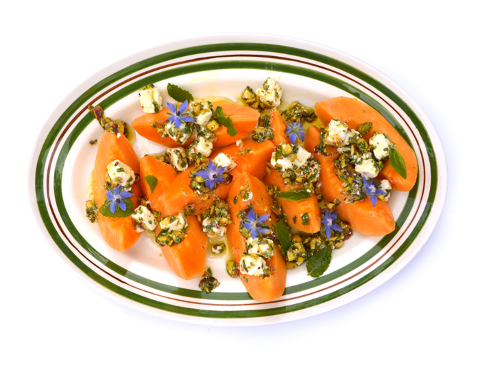 Weer eens wat anders: meloen zónder ham, maar met feta. Die je eerst even laat marineren in een zelfgemaakte pistachepesto. Plus mijn favoriete eetbare versiersel: knalblauw komkommerkruid. Zelfs kinderen vinden het heerlijk.