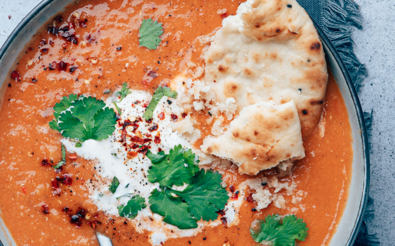Heerlijk, zo’n grote kom dampende rode linzensoep. Comfort food op z’n best. Deze versie met rode linzen, tomaat en Indiase specerijen staat hier regelmatig op tafel. Het fijne aan rode linzen is dat ze snel garen én vanzelf uit elkaar vallen, waardoor je een heerlijk zachte, romige soep krijgt (zonder dat je daar extra room voor nodig hebt!). Lekker met vers naanbrood erbij.