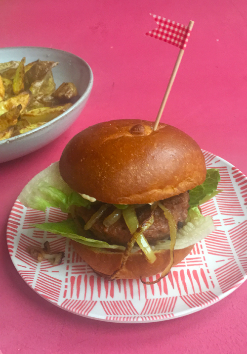 Nu heb ik doorgaans een vrij hard hoofd in vegaburgers. Twee jaar geleden testte ik er een heleboel voor het tv-programma Kassa, en dat was geen onverdeeld genoegen. Ik moet er wel bijzeggen dat we alle burgers kaal aten, dus alleen maar gebakken in wat olie. Geen broodje, geen sla, geen mayo, geen ketchup. Dan wordt de natkartonfactor wel ineens heel prominent. Dat gezegd hebbende, een kale vleeshamburger, zo’n platte schijf uit de supermarkt, smaakt ook vaak naar niks. Mijn eigen hamburger is anders, daar stop ik alle smaakmakers juist alvast ín het vlees. Een a-typische methode die prima bevalt.