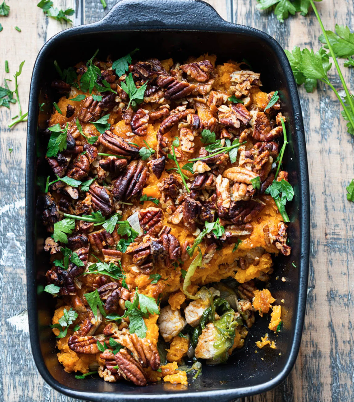 Een heerlijke ovenschotel met een puree van zoete aardappel en lekker veel andijvie in combinatie met kalkoen. De topping van pecannoten maakt echt het verschil!