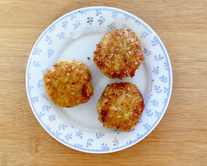 Juist nu, nu in coronatijd elk bezoek aan de supermarkt een onhandig anderhalvemetergeschutter is geworden, is het wel zo prettig als je zo min mogelijk boodschappen hoeft te doen. Dat komt goed uit, dat was altijd al mijn principe. Ik gooi zelden eten weg, want overal kun je nog wel wat lekkers van maken. Eén van de meest dankbare methodes is dus het verbitterballen van kliekjes. Je belangrijkste wapen in de strijd is panko. Knapperig Japans broodkruim, elke supermarkt heeft het tegenwoordig. Niet te vergelijken met fabriekspaneermeel, dat is gruizig en gelijkmatig, dat geeft niet dat lekker knapperige korstje. Dan kun je beter zelf oud brood malen, ook dat geeft een fijn onregelmatig (lees: krokant) effect.
