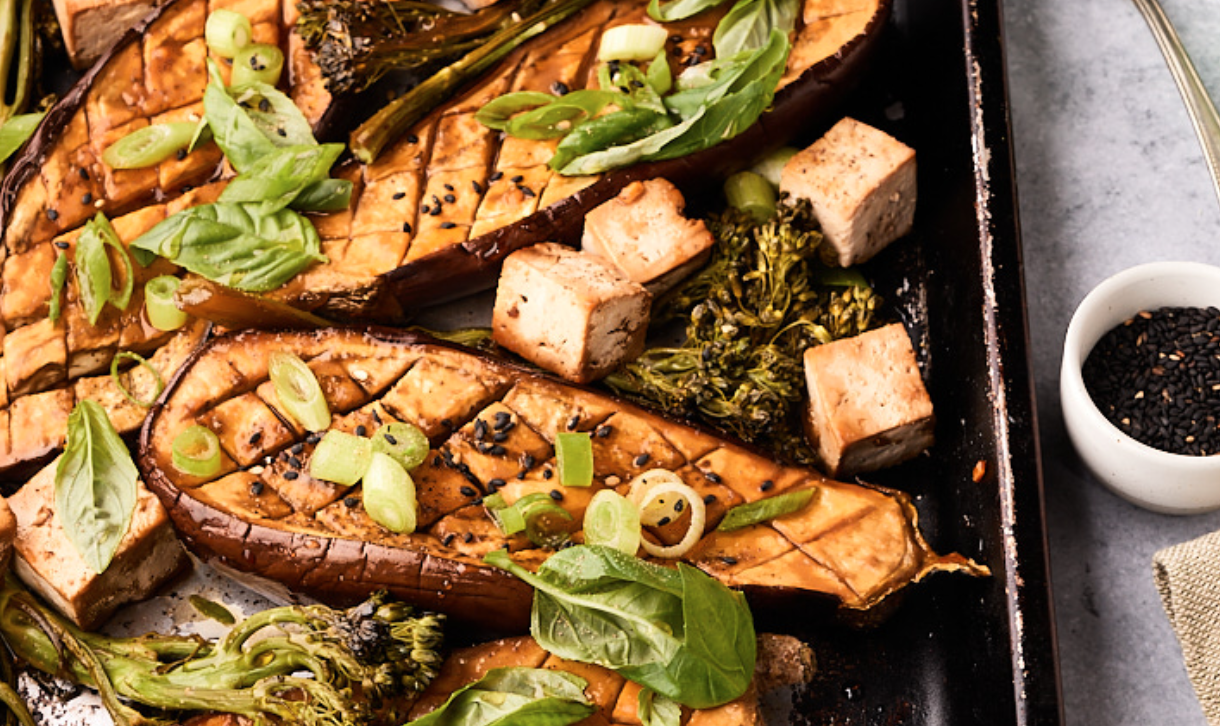 Met deze smaakvolle vegetarische traybake nemen we opnieuw een duik in de Aziatische keuken. Een vega ovenschotel vol verse ingrediënten die perfect bij elkaar passen: aubergines en tofu, miso en bimi, honing en sojasaus, bosui en sesamzaadjes. Het geheel maken we af met geurige Thaise basilicum. Wie mist er vlees? Niemand!