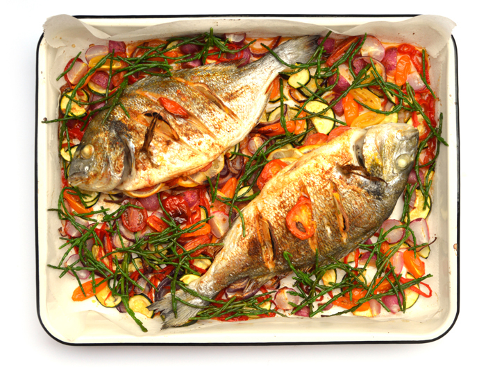 Mijn visboer had zowaar prachtige dorades, die mochten de oven in met een ferme bups groente: courgette, paprika, radijs, tomaten, ui en zeekraal. Fleurig, feestelijk en lekker! En dan kunnen we het meteen even over verantwoorde vis hebben