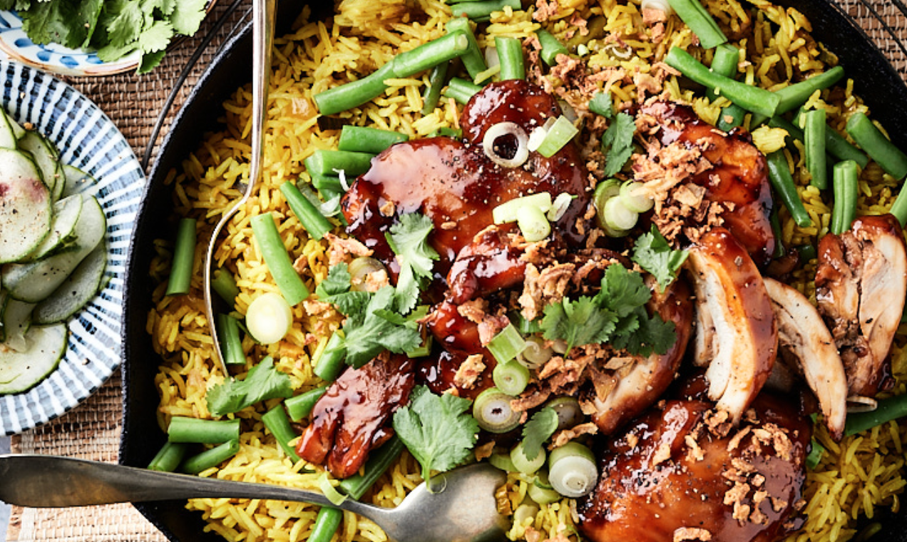 Sticky chicken met rijst, dat klinkt toch meteen als een topper? Sappige kippendijen, omhuld in een zoet-pittige saus die perfect kleverig is — het water loopt ons in ieder geval al in de mond. Deze kip is supermakkelijk om te maken. En die geur? Die lokt iedereen de keuken in! De rijst met sperzieboontjes kook je samen in één pan, lekker handig. Oh, en vergeet die finishing touch niet: een flinke schep knapperige gebakken uitjes voor dat extra beetje crunch.