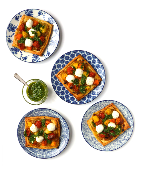 Het is nog altijd volop tomatentijd, ook al bleven mijn zelfgekweekte helaas alsmaar groen. Dus bakte ik taartjes met kerstomaatjes (en mozzarella) uit de winkel, maar wel met zelfgemaakte pesto. Van brandnetels (maar gewoon basilicum kan ook).