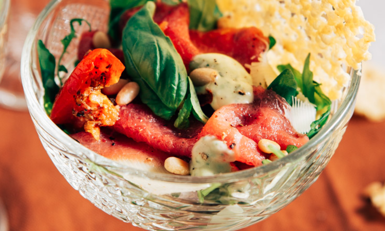 Deze carpaccio in glaasje is een echte showstopper op je borreltafel of als voorgerechtje, zéker met de feestdagen. De combinatie van verse carpaccio, romige basilicum-citroenmayonaise, pittige Zwitserse Appenzeller kaas en krokante kaaskoekjes maakt dit hapje bij iedereen geliefd. Enne, het ziet eruit alsof je uren in de keuken hebt gestaan, maar je zet het zo op tafel…