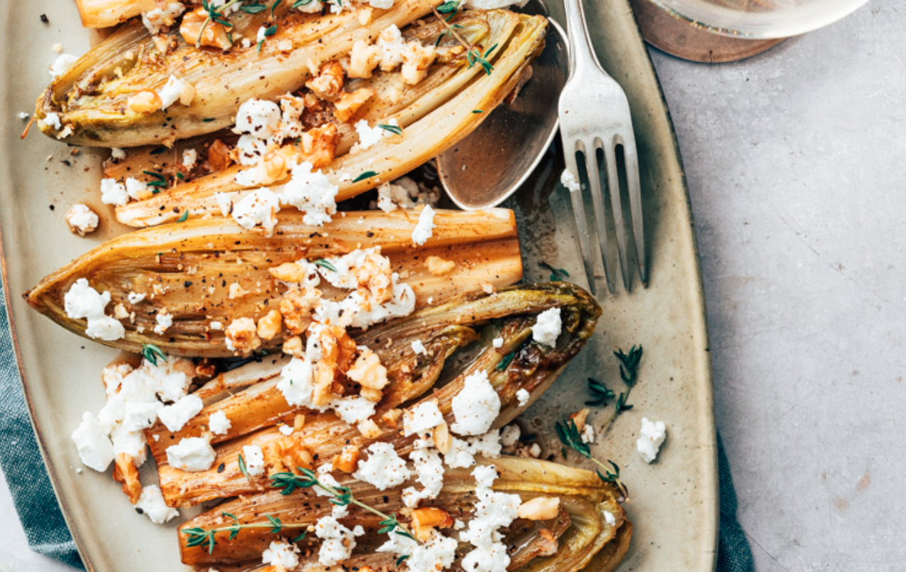 Gekarameliseerde witlof met geitenkaas is zo’n bijgerecht waar we vaak naar teruggrijpen, zeker met de feestdagen of als we een dinertje voor vrienden organiseren. Het is een perfecte mix van bitter, zoet en hartig; die smaken vullen elkaar zó mooi aan. De witlof wordt zacht en krijgt een licht gekarameliseerd laagje door de maple syrup en balsamico. De geitenkaas maakt het romig en de walnoten geven dat lekkere knappertje. Het is elegant genoeg voor een etentje, maar ook makkelijk genoeg voor doordeweeks.