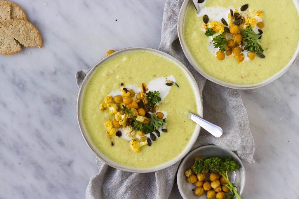 Creamy bloemkool-curry soep met geroosterde kikkererwten
