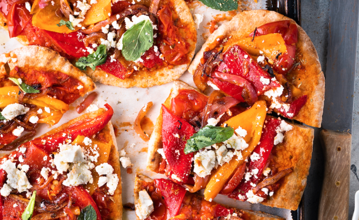 Voor deze vegetarische platbrood pizza gebruiken we als basis zachte, ovale platbroodjes. Die beleggen we met een saus van tomatenblokjes en pittige harissa, gegrilde paprika’s en rode ui. De finishing touch komt van de verkruimelde feta, die een zoute, romige textuur toevoegt, en de verse muntblaadjes, die een tikkie frisheid brengen.