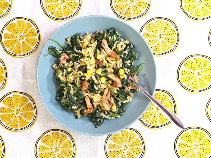Download HealthyApp nu gratis voor iPhoneOrzo met kip en spinazie