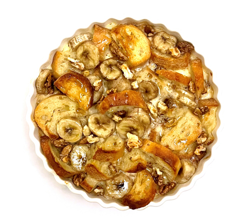 Bananenbrood? Nee, banaan & brood. Een heerlijk warm toetje uit de oven met – je raadt het al – wat overgebleven bananen en (stok)brood, plus walnoten en maple syrup.