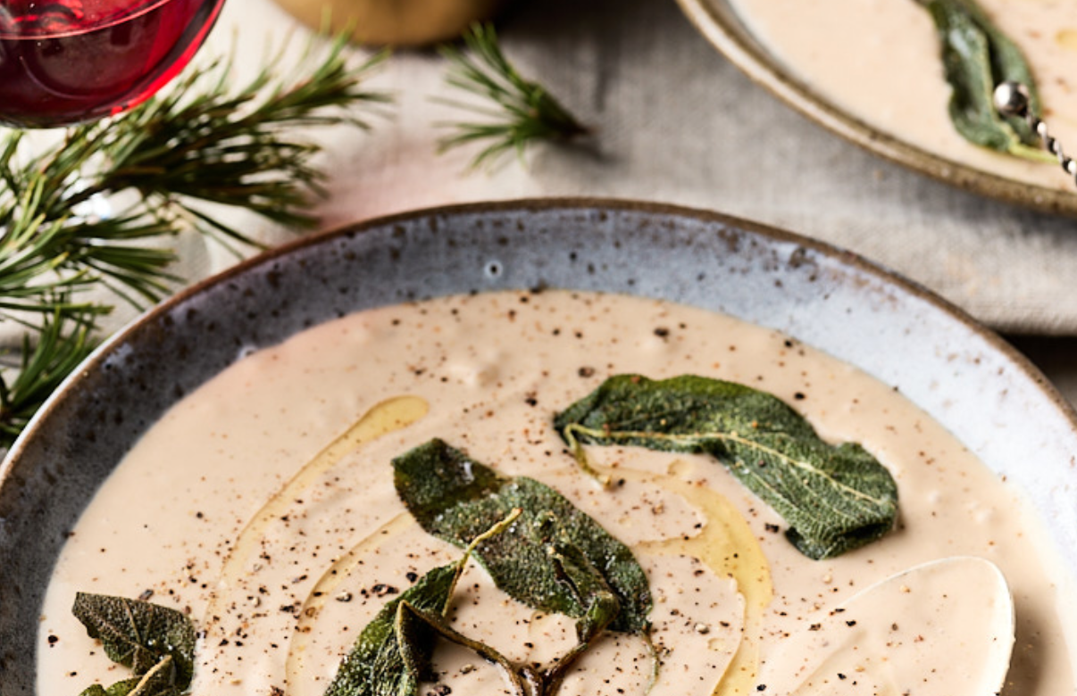 Als we denken aan Kerstmis, denken we aan gezelligheid, kaarsjes aan en natuurlijk lekker eten. En hoe fijn is het als je kerstdiner begint met een soepje dat niet alleen feestelijk smaakt, maar ook makkelijk te maken is? Dezeromige kastanjesoep met knolselderij en krokante salie is precies zo’n kerst voorgerecht. Vol van smaak, heerlijk zacht van structuur en helemaal vegetarisch. En als je plantaardige boter gebruikt, is -ie zelfs vegan. Ideaal dus voor alle soorten eters aan tafel.