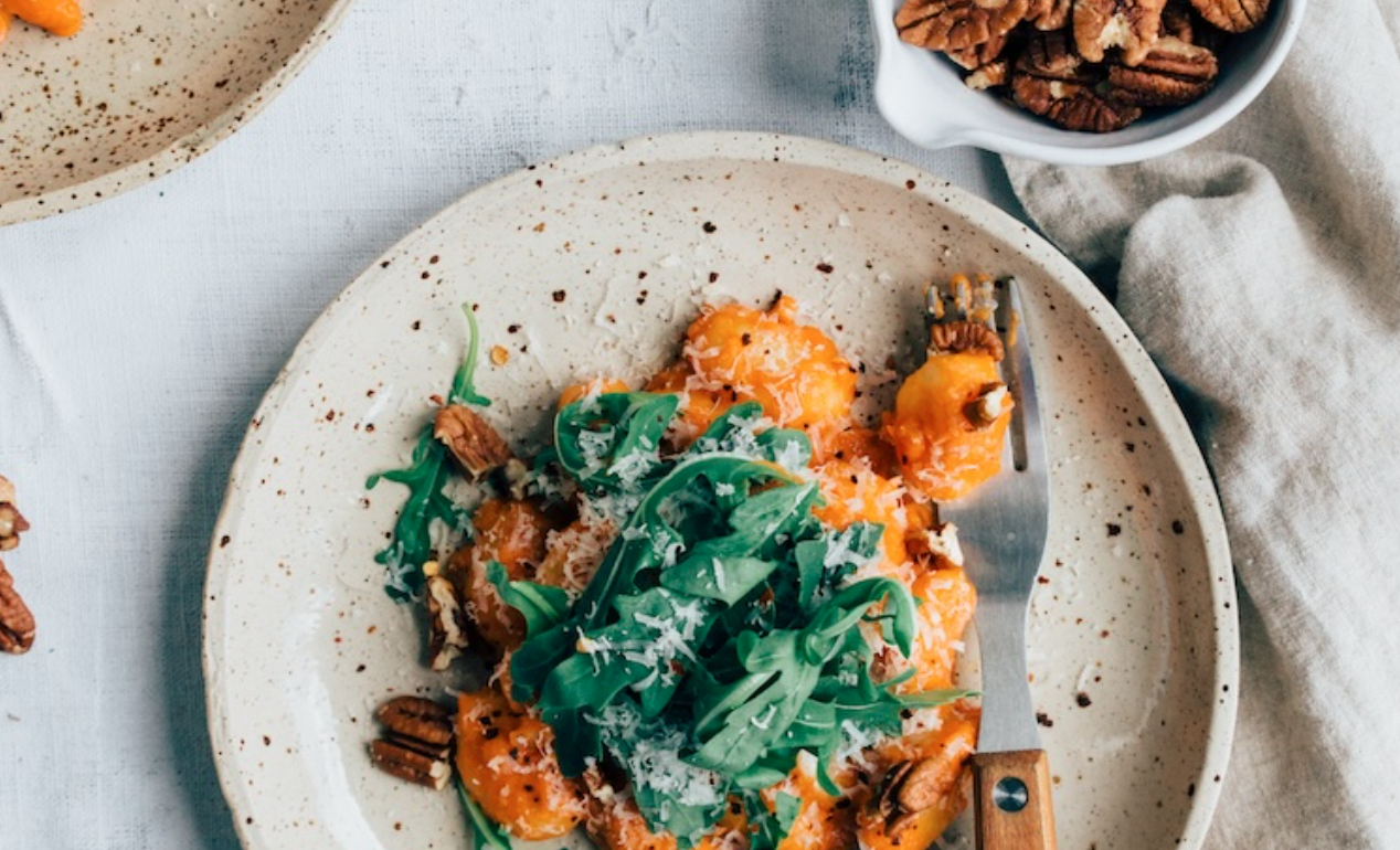Als het buiten koud is, krijgen we zin in warme, romige maaltjes. Deze vegetarische gnocchi met pompoensaus is echt zo’n lekker gerecht waar je blij van wordt. Lekker zacht van smaak, vol geroosterde pompoen en afgemaakt met een handje pecannoten voor de crunch.